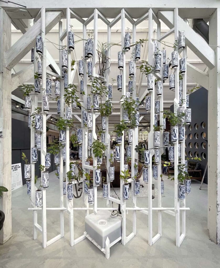 This hydroponic system allows for the cultivation of indigo plants with water recirculation. The vertical structure saves land space, making it suitable for urban landscapes or private spaces.